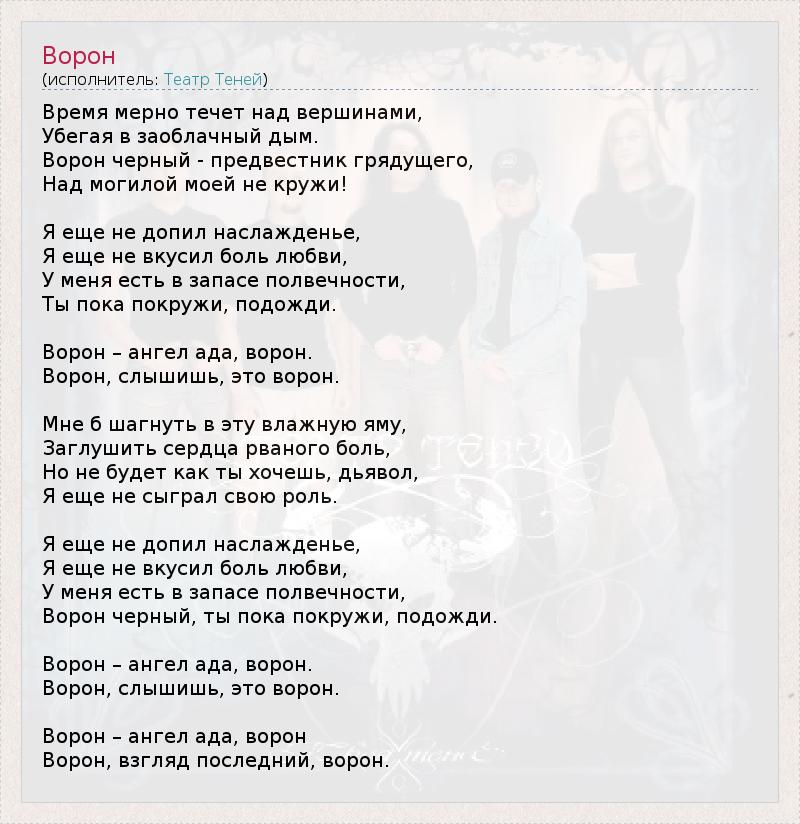 Это интересно:Группа была основана Денисом Машаровым в 1986-ом году.Для начала Театральный репертуар состоял из классики - из тех вещей, которые принадлежат Вечности, которые всегда проникают в самое сердце…Шли годы. Театр Теней подбирал новых актеров. Кто-то уходил из труппы, навсегда унося в своем сердце частичку великолепного спектакля теней…Писались и ставились новые пьесы, пробовались... продолжение