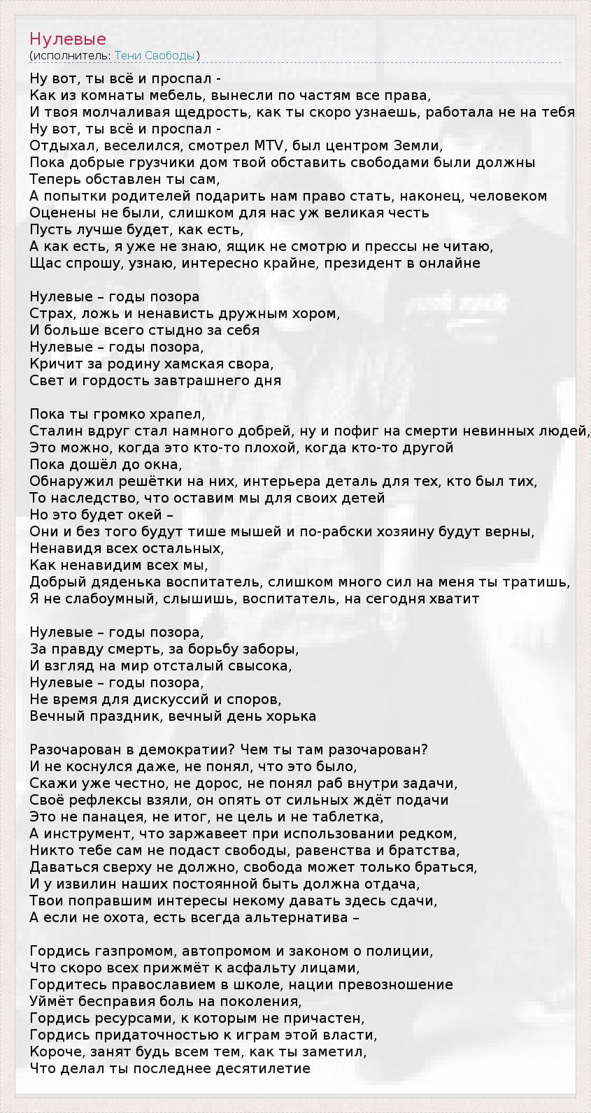 Это интересно:Московская группа ТЕНИ СВОБОДЫ существует с 2004 года, играет панк-рок,сочетающий в себе жёсткость и мелодичность, уделяя большое вниманиене только музыкальной, но и, прежде всего, смысловой стороне своего творчества.На счету группы четыре полноценных альбома:"Где-то за пределом" (АиБ) 2006"Секреты размером с мир" (Свежая струя) 2008"Клуб Здоровья" (Rock-Planet... продолжение
