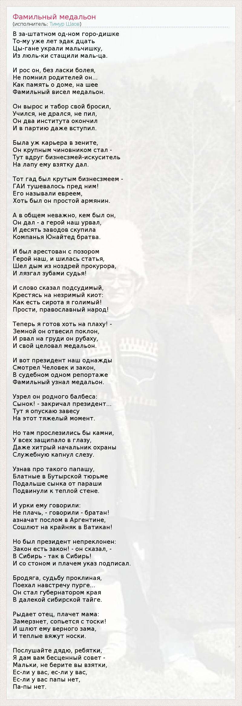 ГлавнаяИсполнителиТимур ШаовФамильный медальон