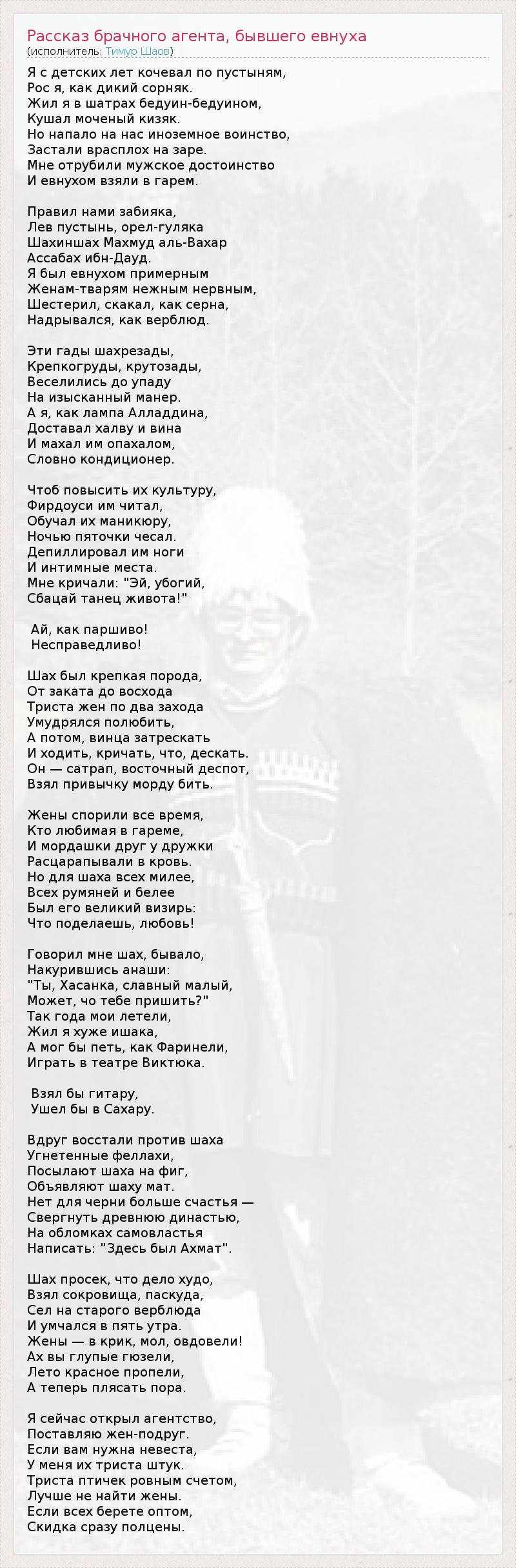 ГлавнаяИсполнителиТимур ШаовРассказ брачного агента, бывшего евнуха