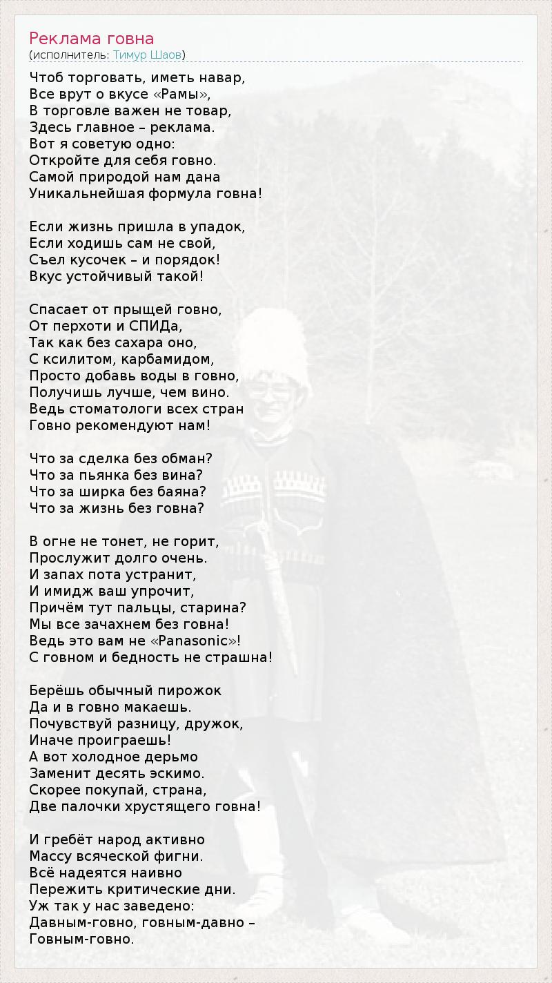 Чтоб торговать, иметь навар, Все врут о вкусе «Рамы», В торговле важен не товар, Здесь главное – реклама. Вот я советую одно: Откройте для себя говно. Самой природой нам дана Уникальнейшая формула говна! Если жизнь пришла в упадок, Если ходишь сам не свой, Съел кусочек – и порядок! Вкус устойчивый такой! Спасает от прыщей говно, От перхоти и СПИДа, Так как без сахара оно, С ксилитом, карбамидом, Просто добавь воды в говно, Получишь лучше, чем вино. Ведь стоматологи всех стран Говно рекомендуют нам! Что за сделка без обман? Что за пьянка без вина? Что за ширка без баяна? Что за жизнь без говна? В огне не тонет, не горит, Прослужит долго очень. И запах пота устранит, И имидж ваш упрочит, Причём тут пальцы, старина? Мы все зачахнем без говна! Ведь это вам не «Panasonic»! С говном и бедность не страшна! Берёшь обычный пирожок Да и в говно макаешь. Почувствуй разницу, дружок, Иначе проиграешь! А вот холодное дерьмо Заменит десять эскимо. Скорее покупай, страна, Две палочки хрустящего говна! И гребёт народ активно Массу всяческой фигни. Всё надеятся наивно Пережить критические дни. Уж так у нас заведено: Давным-говно, говным-давно – Говным-говно.
