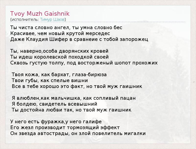 А как ты думаешь, о чем песня "Tvoy Muzh Gaishnik" ?