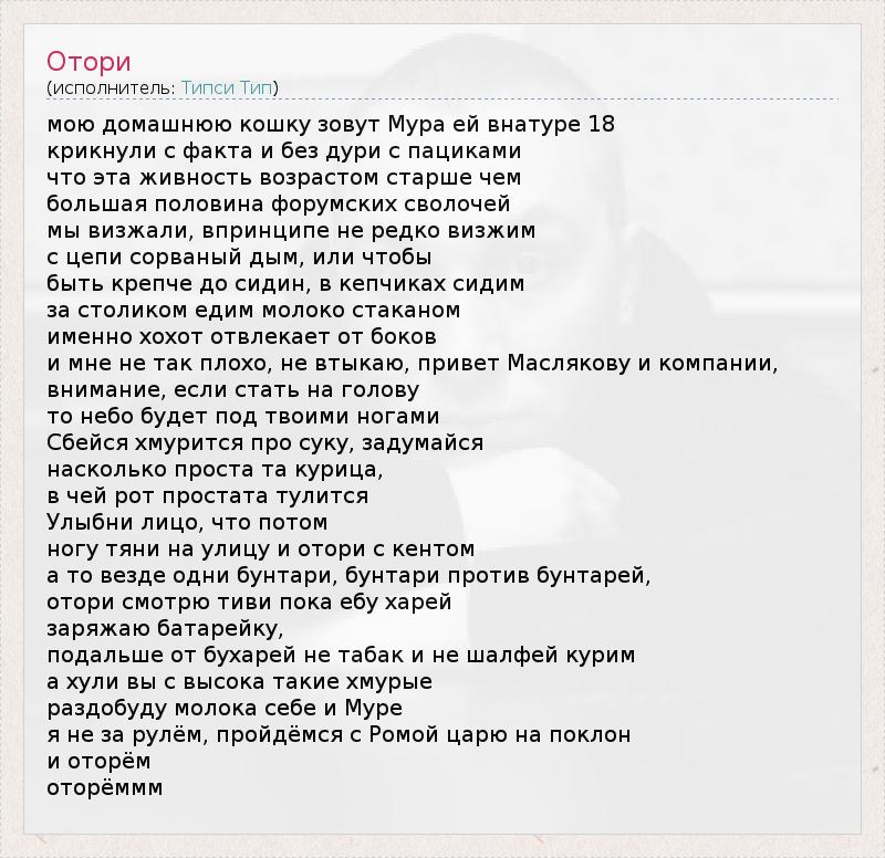 мою домашнюю кошку зовут Мура ей внатуре 18 крикнули с факта и без дури с пациками что эта живность возрастом старше чем большая половина форумских сволочей мы визжали, впринципе не редко визжим с цепи сорваный дым, или чтобы быть крепче до сидин, в кепчиках сидим за столиком едим молоко стаканом именно хохот отвлекает от боков и мне не так плохо, не втыкаю, привет Маслякову и компании, внимание, если стать на голову то небо будет под твоими ногами Сбейся хмурится про суку, задумайся насколько проста та курица, в чей рот простата тулится Улыбни лицо, что потом ногу тяни на улицу и отори с кентом а то везде одни бунтари, бунтари против бунтарей, отори смотрю тиви пока ебу харей заряжаю батарейку, подальше от бухарей не табак и не шалфей курим а хули вы с высока такие хмурые раздобуду молока себе и Муре я не за рулём, пройдёмся с Ромой царю на поклон и оторём оторёммм