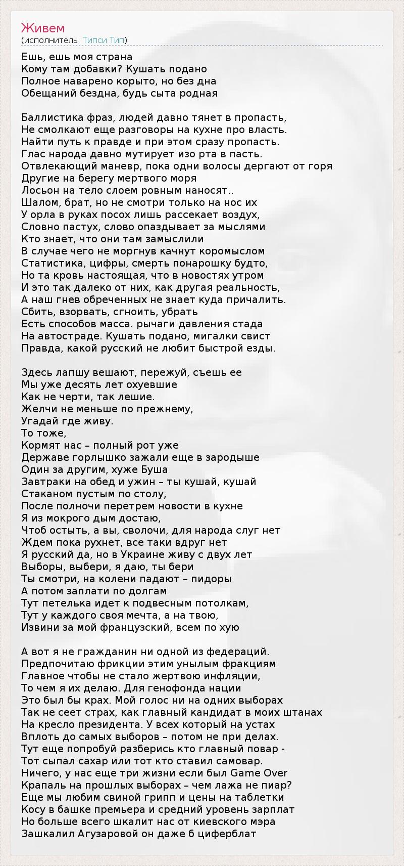 Ешь, ешь моя страна Кому там добавки? Кушать подано Полное наварено корыто, но без дна Обещаний бездна, будь сыта родная Баллистика фраз, людей давно тянет в пропасть, Не смолкают еще разговоры на кухне про власть. Найти путь к правде и при этом сразу пропасть. Глас народа давно мутирует изо рта в пасть. Отвлекающий маневр, пока одни волосы дергают от горя Другие на берегу мертвого моря Лосьон на тело слоем ровным наносят.. Шалом, брат, но не смотри только на нос их У орла в руках посох лишь рассекает воздух, Словно пастух, слово опаздывает за мыслями Кто знает, что они там замыслили В случае чего не моргнув качнут коромыслом Статистика, цифры, смерть понарошку будто, Но та кровь настоящая, что в новостях утром И это так далеко от них, как другая реальность, А наш гнев обреченных не знает куда причалить. Сбить, взорвать, сгноить, убрать Есть способов масса. рычаги давления стада На автостраде. Кушать подано, мигалки свист Правда, какой русский не любит быстрой езды. Здесь лапшу вешают, пережуй, съешь ее Мы уже десять лет охуевшие Как не черти, так лешие. Желчи не меньше по прежнему, Угадай где живу. То тоже, Кормят нас – полный рот уже Державе горлышко зажали еще в зародыше Один за другим, хуже Буша Завтраки на обед и ужин – ты кушай, кушай Стаканом пустым по столу, После полночи перетрем новости в кухне Я из мокрого дым достаю, Чтоб остыть, а вы, сволочи, для народа слуг нет Ждем пока рухнет, все таки вдруг нет Я русский да, но в Украине живу с двух лет Выборы, выбери, я даю, ты бери Ты смотри, на колени падают – пидоры А потом заплати по долгам Тут петелька идет к подвесным потолкам, Тут у каждого своя мечта, а на твою, Извини за мой французский, всем по хую А вот я не гражданин ни одной из федераций. Предпочитаю фрикции этим унылым фракциям Главное чтобы не стало жертвою инфляции, То чем я их делаю. Для генофонда нации Это был бы крах. Мой голос ни на одних выборах Так не сеет страх, как главный кандидат в моих штанах На кресло президента. У всех который на устах Вплоть до самых выборов – потом не при делах. Тут еще попробуй разберись кто главный повар - Тот сыпал сахар или тот кто ставил самовар. Ничего, у нас еще три жизни если был Game Over Крапаль на прошлых выборах – чем лажа не пиар? Еще мы любим свиной грипп и цены на таблетки Косу в башке премьера и средний уровень зарплат Но больше всего шкалит нас от киевского мэра Зашкалил Агузаровой он даже б циферблат
