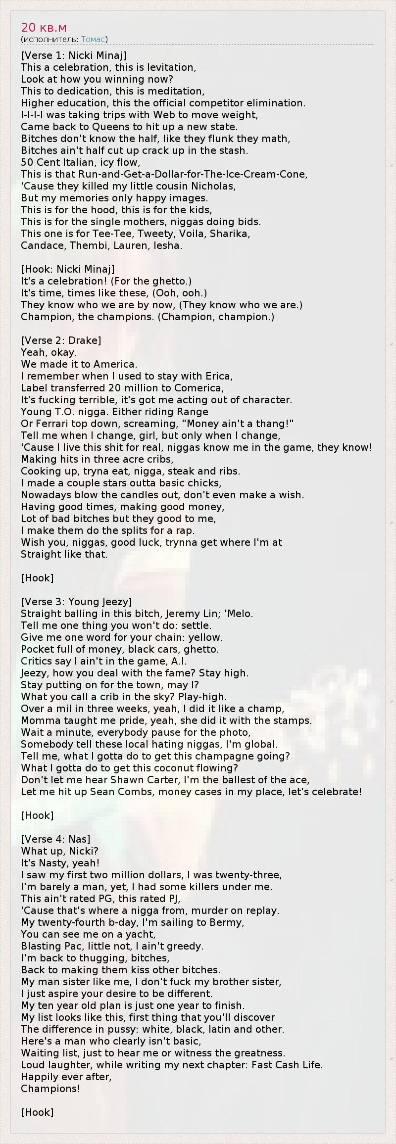 [Verse 1: Nicki Minaj] This a celebration, this is levitation, Look at how you winning now? This to dedication, this is meditation, Higher education, this the official competitor elimination. I-I-I-I was taking trips with Web to move weight, Came back to Queens to hit up a new state. Bitches don't know the half, like they flunk they math, Bitches ain't half cut up crack up in the stash. 50 Cent Italian, icy flow, This is that Run-and-Get-a-Dollar-for-The-Ice-Cream-Cone, 'Cause they killed my little cousin Nicholas, But my memories only happy images. This is for the hood, this is for the kids, This is for the single mothers, niggas doing bids. This one is for Tee-Tee, Tweety, Voila, Sharika, Candace, Thembi, Lauren, Iesha. [Hook: Nicki Minaj] It's a celebration! (For the ghetto.) It's time, times like these, (Ooh, ooh.) They know who we are by now, (They know who we are.) Champion, the champions. (Champion, champion.) [Verse 2: Drake] Yeah, okay. We made it to America. I remember when I used to stay with Erica, Label transferred 20 million to Comerica, It's fucking terrible, it's got me acting out of character. Young T.O. nigga. Either riding Range Or Ferrari top down, screaming, "Money ain't a thang!" Tell me when I change, girl, but only when I change, 'Cause I live this shit for real, niggas know me in the game, they know! Making hits in three acre cribs, Cooking up, tryna eat, nigga, steak and ribs. I made a couple stars outta basic chicks, Nowadays blow the candles out, don't even make a wish. Having good times, making good money, Lot of bad bitches but they good to me, I make them do the splits for a rap. Wish you, niggas, good luck, trynna get where I'm at Straight like that. [Hook] [Verse 3: Young Jeezy] Straight balling in this bitch, Jeremy Lin; 'Melo. Tell me one thing you won't do: settle. Give me one word for your chain: yellow. Pocket full of money, black cars, ghetto. Critics say I ain't in the game, A.I. Jeezy, how you deal with the fame? Stay high. Stay putting on for the town, may I? What you call a crib in the sky? Play-high. Over a mil in three weeks, yeah, I did it like a champ, Momma taught me pride, yeah, she did it with the stamps. Wait a minute, everybody pause for the photo, Somebody tell these local hating niggas, I'm global. Tell me, what I gotta do to get this champagne going? What I gotta do to get this coconut flowing? Don't let me hear Shawn Carter, I'm the ballest of the ace, Let me hit up Sean Combs, money cases in my place, let's celebrate! [Hook] [Verse 4: Nas] What up, Nicki? It's Nasty, yeah! I saw my first two million dollars, I was twenty-three, I'm barely a man, yet, I had some killers under me. This ain't rated PG, this rated PJ, 'Cause that's where a nigga from, murder on replay. My twenty-fourth b-day, I'm sailing to Bermy, You can see me on a yacht, Blasting Pac, little not, I ain't greedy. I'm back to thugging, bitches, Back to making them kiss other bitches. My man sister like me, I don't fuck my brother sister, I just aspire your desire to be different. My ten year old plan is just one year to finish. My list looks like this, first thing that you'll discover The difference in pussy: white, black, latin and other. Here's a man who clearly isn't basic, Waiting list, just to hear me or witness the greatness. Loud laughter, while writing my next chapter: Fast Cash Life. Happily ever after, Champions! [Hook]