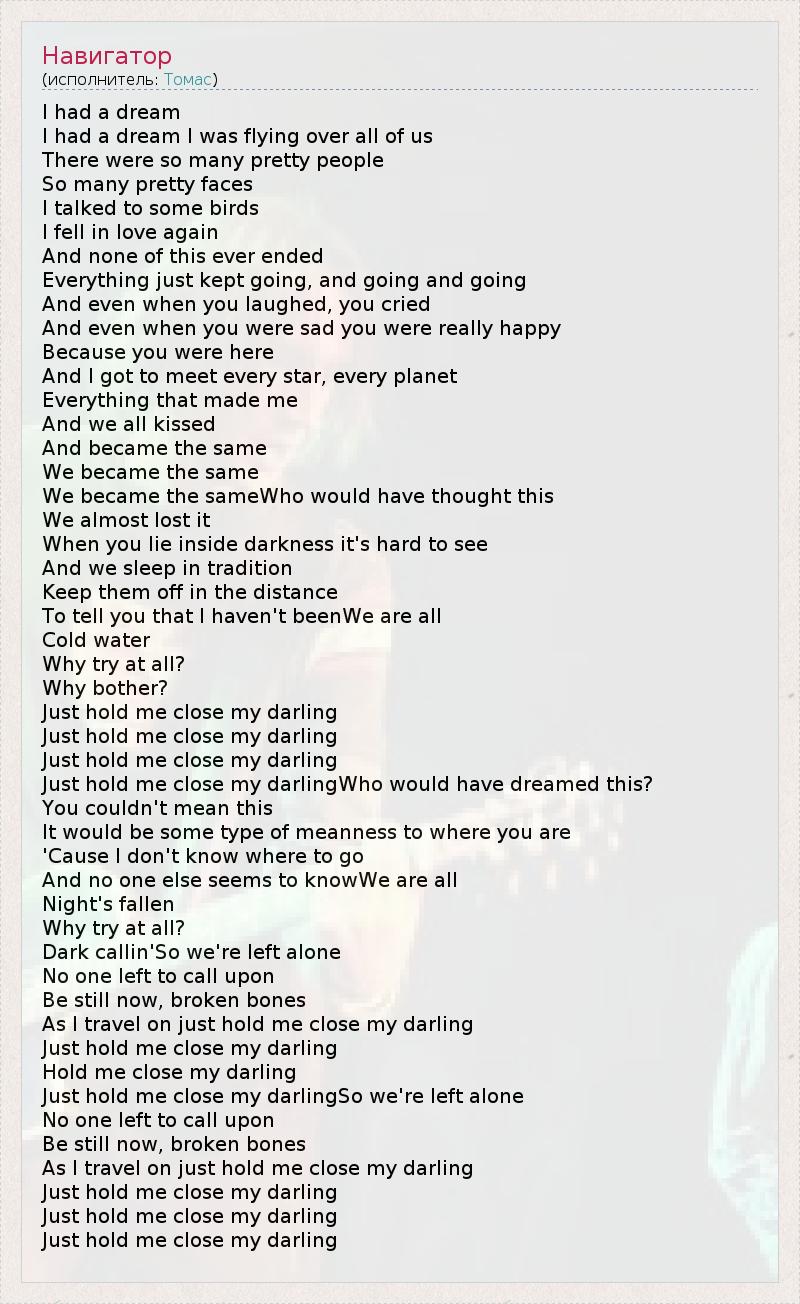 I had a dream I had a dream I was flying over all of us There were so many pretty people So many pretty faces I talked to some birds I fell in love again And none of this ever ended Everything just kept going, and going and going And even when you laughed, you cried And even when you were sad you were really happy Because you were here And I got to meet every star, every planet Everything that made me And we all kissed And became the same We became the same We became the sameWho would have thought this We almost lost it When you lie inside darkness it's hard to see And we sleep in tradition Keep them off in the distance To tell you that I haven't beenWe are all Cold water Why try at all? Why bother? Just hold me close my darling Just hold me close my darling Just hold me close my darling Just hold me close my darlingWho would have dreamed this? You couldn't mean this It would be some type of meanness to where you are 'Cause I don't know where to go And no one else seems to knowWe are all Night's fallen Why try at all? Dark callin'So we're left alone No one left to call upon Be still now, broken bones As I travel on just hold me close my darling Just hold me close my darling Hold me close my darling Just hold me close my darlingSo we're left alone No one left to call upon Be still now, broken bones As I travel on just hold me close my darling Just hold me close my darling Just hold me close my darling Just hold me close my darling