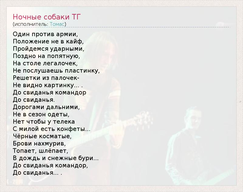 ГлавнаяИсполнителиТомасНочные собаки ТГ