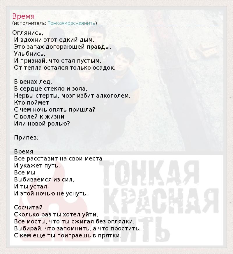 Это интересно:ТонкаяКраснаяНить — украинская рок-группа, играющая в стиле металкор. Образована в 2005 году в городе Харьков.Дата образования группы — осень 2005 года. С того момента состав группы неоднократно менялся до июля 2008 года, когда прекратились постоянные замены барабанщика. Им стал Антон Кубрак, игравший вместе с гитаристом «ТКН» Вячеславом Бровко в харьковской группе «7th Sky». Экспериментируя... продолжение