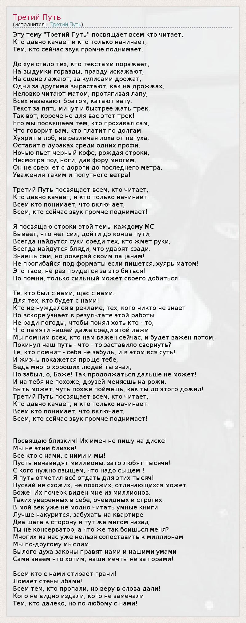 Эту тему "Третий Путь" посвящает всем кто читает, Кто давно качает и кто только начинает, Тем, кто сейчас звук громче поднимает. До хуя стало тех, кто текстами поражает, На выдумки горазды, правду искажают, На сцене лажают, за кулисами дрожат, Одни за другими вырастают, как на дрожжах, Неловко читают матом, протягивая лапу, Всех называют братом, катают вату. Текст за пять минут и быстрее жать трек, Так вот, короче не для вас этот трек! Его мы посвящаем тем, кто прохавал сам, Что говорит вам, кто платит по долгам Хуярит в лоб, не различая лоха от петуха, Оставит в дураках среди одних профи. Ночью пьет черный кофе, рождая строки, Несмотря под ноги, дав фору многим, Он не свернет с дороги до последнего метра, Уважения таким и попутного ветра! Третий Путь посвящает всем, кто читает, Кто давно качает, и кто только начинает. Всем кто понимает, что включает, Всем, кто сейчас звук громче поднимает! Я посвящаю строки этой темы каждому МС Бывает, что нет сил, дойти до конца пути, Всегда найдутся суки среди тех, кто жмет руки, Всегда найдутся бляди, что ударят сзади. Знаешь сам, но доверяй своим пацанам! Не прогибайся под форматы если пишется, хуярь матом! Это твое, не раз придется за это биться! Но помни, только сильный может своего добиться! Те, кто был с нами, щас с нами. Для тех, кто будет с нами! Кто не нуждался в рекламе, тех, кого никто не знает Но вскоре узнает в результате этой работы Не ради погоды, чтобы понял хоть кто - то, Что памяти нашей даже среди этой лажи Мы помним всех, кто нам важен сейчас, и будет важен потом, Покинул наш путь - что - то заставило свернуть? Те, кто помнит - себя не забудь, и в этом вся суть! И жизнь покажется проще тебе, Ведь много хороших людей ты знал, Но забыл, о, Боже! Так продолжаться дальше не может! И на тебя не похоже, друзей меняешь на рожи. Быть может, чуть позже поймешь, как ты до этого дожил! Третий Путь посвящает всем, кто читает, Кто давно качает, и кто только начинает. Всем кто понимает, что включает, Всем, кто сейчас звук громче поднимает! Посвящаю близким! Их имен не пишу на диске! Мы не этим близки! Все кто с нами, с ними и мы! Пусть ненавидят миллионы, зато любят тысячи! С кого нужно взыщем, что надо сыщем ! Я путь отметил всё отдать для этих тысяч! Пускай не схожих, не похожих, отличающихся может Боже! Их почерк виден мне из миллионов. Таких уверенных в себе, очевидных и строгих. В мой век уже не модно читать умные книги Лучше накурится, забухать на квартире Два шага в сторону и тут же мигом назад Ты не консерватор, а что же так боишься меня? Многих из нас уже нельзя сопоставить к миллионам Мы по-другому мыслим. Былого духа законы правят нами и нашими умами Сами знаем что хотим, наши мечты не за горами! Всем кто с нами стирает грани! Ломает стены лбами! Всем тем, кто пропали, но веру в слова дали! Кого не видно издали, кого не замечали Тем, кто далеко, но по любому с нами!