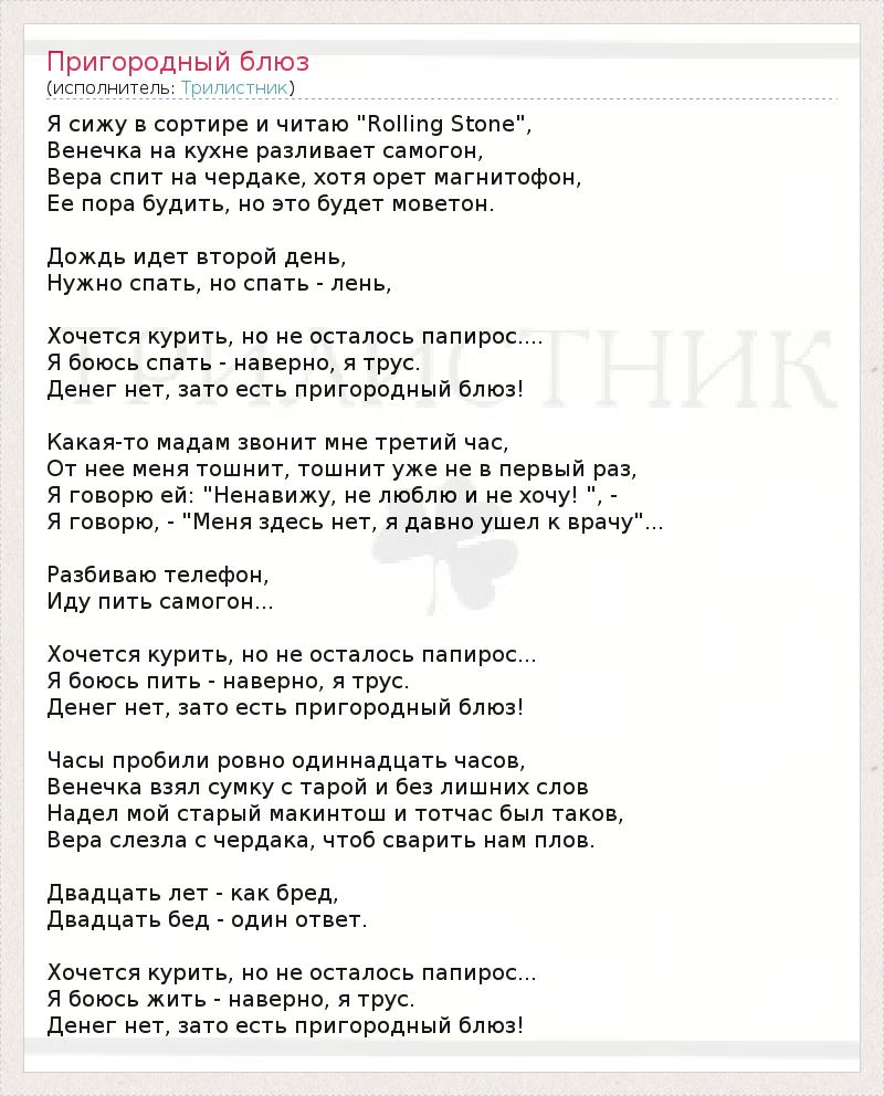 Я сижу в сортире и читаю "Rolling Stone", Венечка на кухне разливает самогон, Вера спит на чердаке, хотя орет магнитофон, Ее пора будить, но это будет моветон. Дождь идет второй день, Нужно спать, но спать - лень, Хочется курить, но не осталось папирос.... Я боюсь спать - наверно, я трус. Денег нет, зато есть пригородный блюз! Какая-то мадам звонит мне третий час, От нее меня тошнит, тошнит уже не в первый раз, Я говорю ей: "Ненавижу, не люблю и не хочу! ", - Я говорю, - "Меня здесь нет, я давно ушел к врачу"... Разбиваю телефон, Иду пить самогон... Хочется курить, но не осталось папирос... Я боюсь пить - наверно, я трус. Денег нет, зато есть пригородный блюз! Часы пробили ровно одиннадцать часов, Венечка взял сумку с тарой и без лишних слов Надел мой старый макинтош и тотчас был таков, Вера слезла с чердака, чтоб сварить нам плов. Двадцать лет - как бред, Двадцать бед - один ответ. Хочется курить, но не осталось папирос... Я боюсь жить - наверно, я трус. Денег нет, зато есть пригородный блюз!