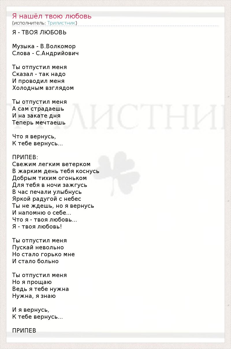 Я - ТВОЯ ЛЮБОВЬ Музыка - В.Волкомор Слова - С.Андрийович Ты отпустил меня Сказал - так надо И проводил меня Холодным взглядом Ты отпустил меня А сам страдаешь И на закате дня Теперь мечтаешь Что я вернусь, К тебе вернусь... ПРИПЕВ: Свежим легким ветерком В жарким день тебя коснусь Добрым тихим огоньком Для тебя в ночи зажгусь В час печали улыбнусь Яркой радугой с небес Ты не ждешь, но я вернусь И напомню о себе... Что я - твоя любовь... Я - твоя любовь! Ты отпустил меня Пускай невольно Но стало горько мне И стало больно Ты отпустил меня Но я прощаю Ведь я тебе нужна Нужна, я знаю И я вернусь, К тебе вернусь... ПРИПЕВ