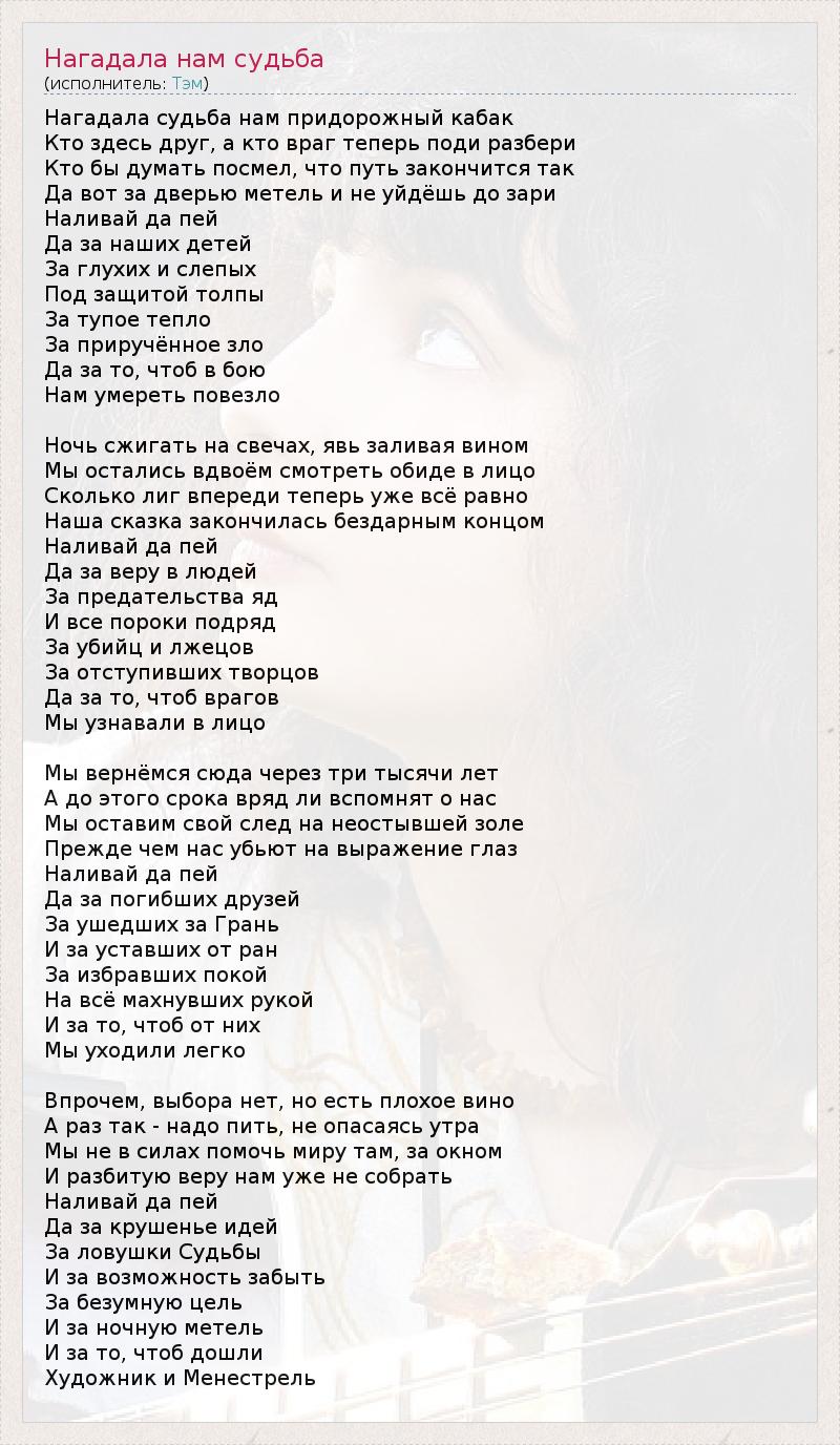 А как ты думаешь, о чем песня "Нагадала нам судьба" ?