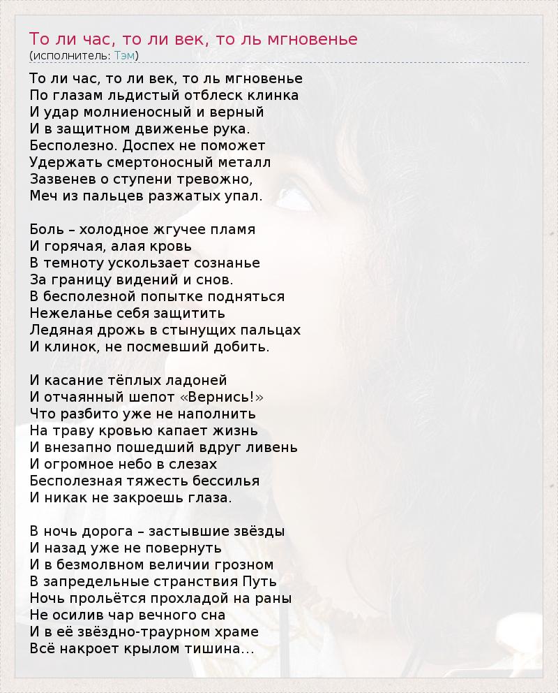 ГлавнаяИсполнителиТэмТо ли час, то ли век, то ль мгновенье