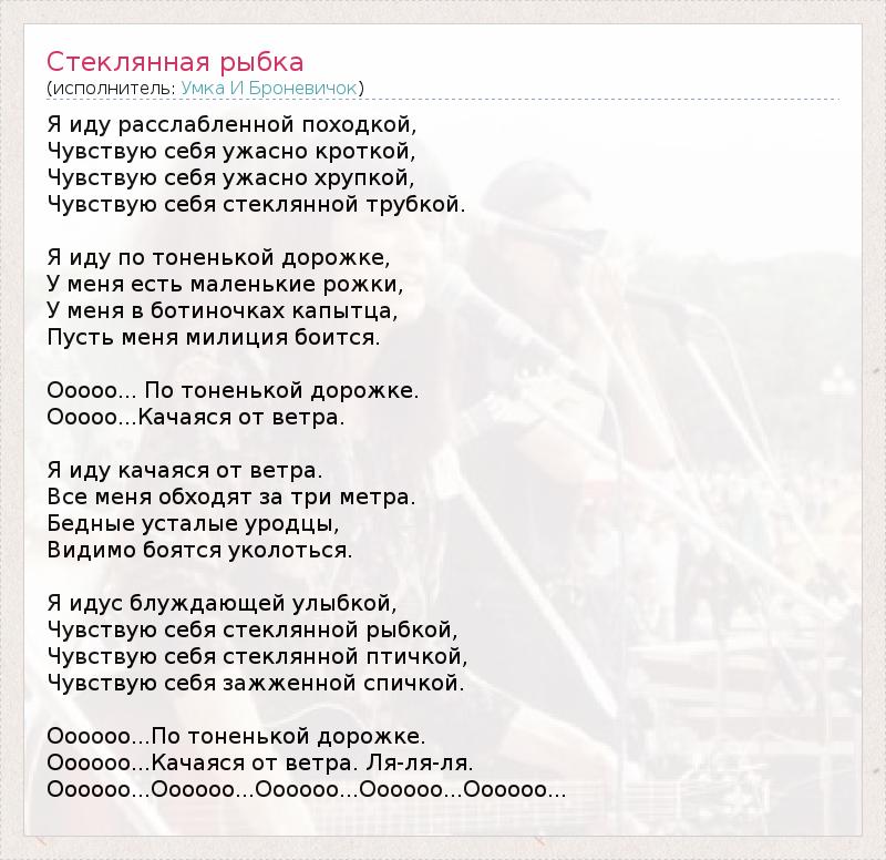 Я иду расслабленной походкой, Чувствую себя ужасно кроткой, Чувствую себя ужасно хрупкой, Чувствую себя стеклянной трубкой. Я иду по тоненькой дорожке, У меня есть маленькие рожки, У меня в ботиночках капытца, Пусть меня милиция боится. Ооооо... По тоненькой дорожке. Ооооо...Качаяся от ветра. Я иду качаяся от ветра. Все меня обходят за три метра. Бедные усталые уродцы, Видимо боятся уколоться. Я идус блуждающей улыбкой, Чувствую себя стеклянной рыбкой, Чувствую себя стеклянной птичкой, Чувствую себя зажженной спичкой. Оооооо...По тоненькой дорожке. Оооооо...Качаяся от ветра. Ля-ля-ля. Оооооо...Оооооо...Оооооо...Оооооо...Оооооо...