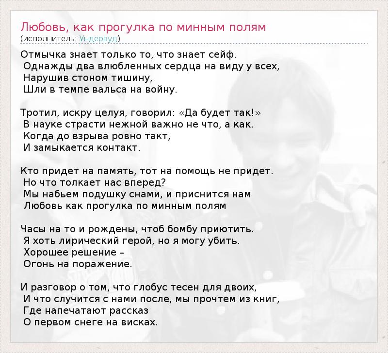 ГлавнаяИсполнителиУндервудЛюбовь, как прогулка по минным полям