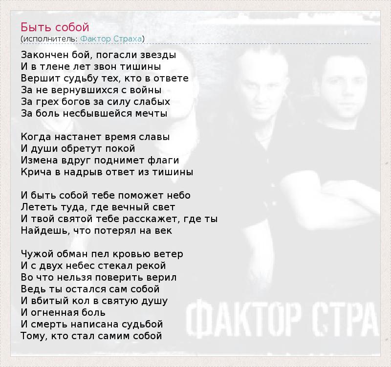 Закончен бой, погасли звезды И в тлене лет звон тишины Вершит судьбу тех, кто в ответе За не вернувшихся с войны За грех богов за силу слабых За боль несбывшейся мечты Когда настанет время славы И души обретут покой Измена вдруг поднимет флаги Крича в надрыв ответ из тишины И быть собой тебе поможет небо Лететь туда, где вечный свет И твой святой тебе расскажет, где ты Найдешь, что потерял на век Чужой обман пел кровью ветер И с двух небес стекал рекой Во что нельзя поверить верил Ведь ты остался сам собой И вбитый кол в святую душу И огненная боль И смерть написана судьбой Тому, кто стал самим собой