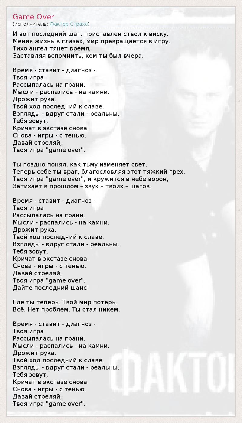 Это интересно:ФАКТОР СТРАХА как коллектив сформировался осенью 2004 года. Участники: Константин "Кот" Селезнев – гитараАлександр "Kuzoff" Кузавов – гитараМихаил Сидоренко – вокал Музыканты знакомы друг с другом больше пятнадцати лет и за это время создали такие группы как: ТРИЗНА, КАРДАННЫЙ ВАЛ, БОНИ НЕМ, ФАКТОР СТРАХА и другие. Они вместе и врозь успели, записать и... продолжение