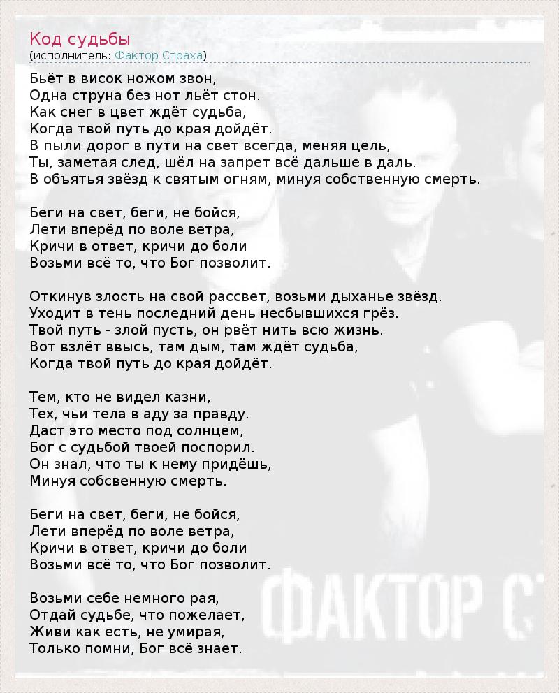 Бьёт в висок ножом звон, Одна струна без нот льёт стон. Как снег в цвет ждёт судьба, Когда твой путь до края дойдёт. В пыли дорог в пути на свет всегда, меняя цель, Ты, заметая след, шёл на запрет всё дальше в даль. В объятья звёзд к святым огням, минуя собственную смерть. Беги на свет, беги, не бойся, Лети вперёд по воле ветра, Кричи в ответ, кричи до боли Возьми всё то, что Бог позволит. Откинув злость на свой рассвет, возьми дыханье звёзд. Уходит в тень последний день несбывшихся грёз. Твой путь - злой пусть, он рвёт нить всю жизнь. Вот взлёт ввысь, там дым, там ждёт судьба, Когда твой путь до края дойдёт. Тем, кто не видел казни, Тех, чьи тела в аду за правду. Даст это место под солнцем, Бог с судьбой твоей поспорил. Он знал, что ты к нему придёшь, Минуя собсвенную смерть. Беги на свет, беги, не бойся, Лети вперёд по воле ветра, Кричи в ответ, кричи до боли Возьми всё то, что Бог позволит. Возьми себе немного рая, Отдай судьбе, что пожелает, Живи как есть, не умирая, Только помни, Бог всё знает.