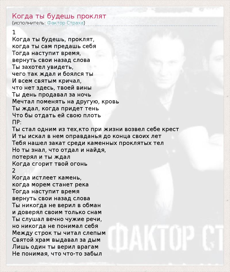 1 Когда ты будешь, проклят, когда ты сам предашь себя Тогда наступит время, вернуть свои назад слова Ты захотел увидеть, чего так ждал и боялся ты И всем святым кричал, что нет здесь, твоей вины Ты день продавал за ночь Мечтал поменять на другую, кровь Ты ждал, когда придет тень Что бы отдать ей свою плоть ПР: Ты стал одним из тех,кто при жизни возвел себе крест И ты искал в нем оправданья до конца своих лет Тебя нашел закат среди каменных проклятых тел Но ты знал, что отдал и найдя, потерял и ты ждал Когда сгорит твой огонь 2 Когда истлеет камень, когда морем станет река Тогда наступит время вернуть свои назад слова Ты никогда не верил в обман и доверял своим только снам Ты слушал вечно чужие речи, но никогда не понимал себя Между строк ты читал слепым Святой храм выдавал за дым Лишь один ты верил врагам Не понимая, что что-то забыл