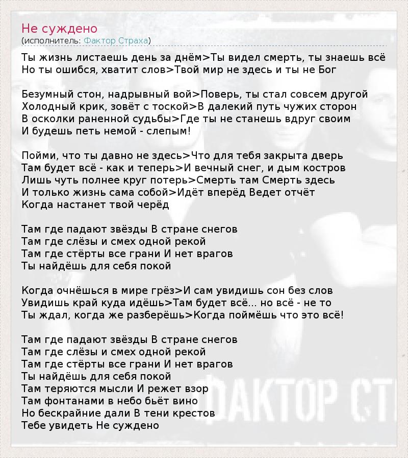 Ты жизнь листаешь день за днём>Ты видел смерть, ты знаешь всё Но ты ошибся, хватит слов>Твой мир не здесь и ты не Бог Безумный стон, надрывный вой>Поверь, ты стал совсем другой Холодный крик, зовёт с тоской>В далекий путь чужих сторон В осколки раненной судьбы>Где ты не станешь вдруг своим И будешь петь немой - слепым! Пойми, что ты давно не здесь>Что для тебя закрыта дверь Там будет всё - как и теперь>И вечный снег, и дым костров Лишь чуть полнее круг потерь>Смерть там Смерть здесь И только жизнь сама собой>Идёт вперёд Ведет отчёт Когда настанет твой черёд Там где падают звёзды В стране снегов Там где слёзы и смех одной рекой Там где стёрты все грани И нет врагов Ты найдёшь для себя покой Когда очнёшься в мире грёз>И сам увидишь сон без слов Увидишь край куда идёшь>Там будет всё... но всё - не то Ты ждал, когда же разберёшь>Когда поймёшь что это всё! Там где падают звёзды В стране снегов Там где слёзы и смех одной рекой Там где стёрты все грани И нет врагов Ты найдёшь для себя покой Там теряются мысли И режет взор Там фонтанами в небо бьёт вино Но бескрайние дали В тени крестов Тебе увидеть Не суждено