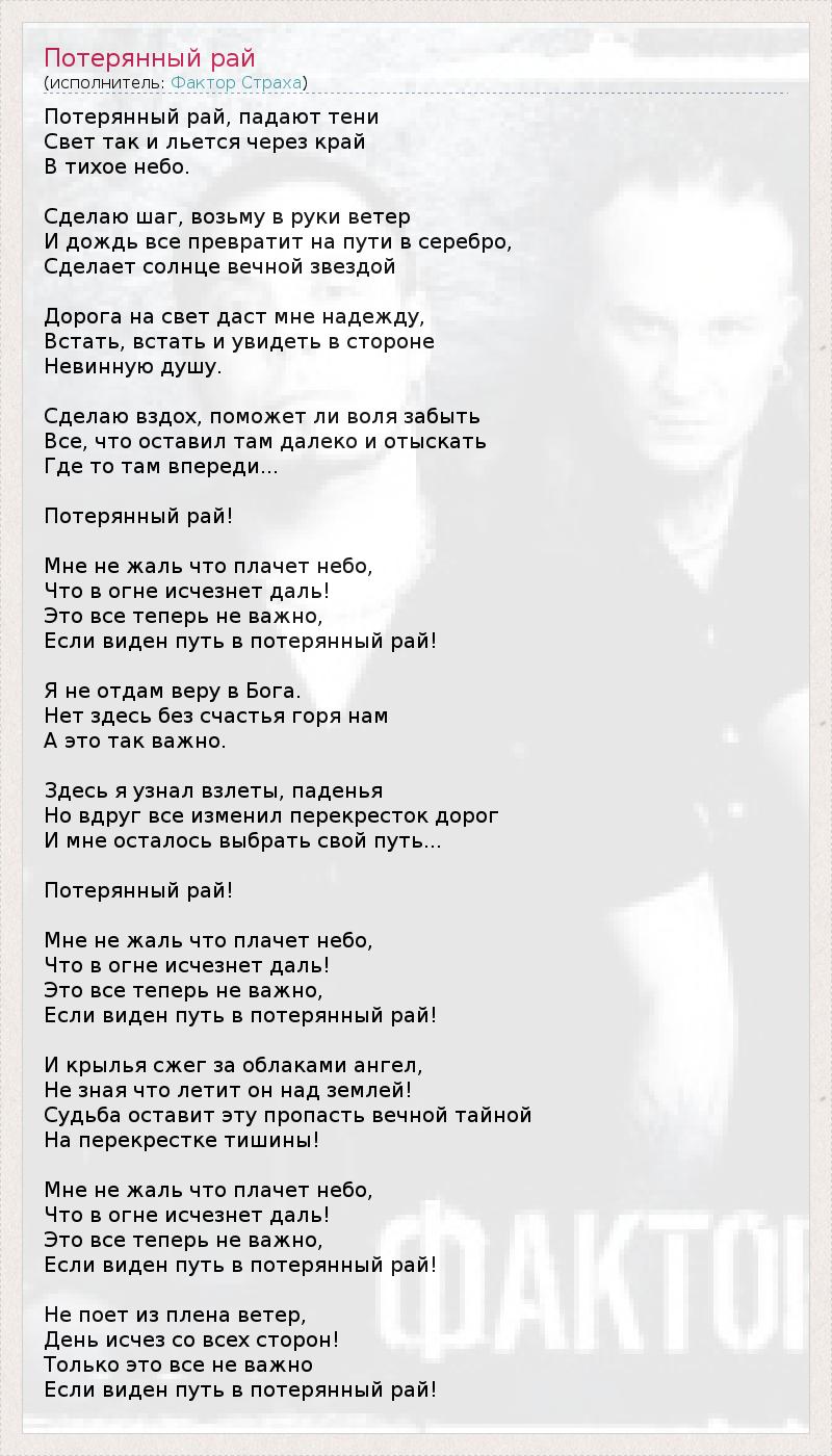 Потерянный рай, падают тени Свет так и льется через край В тихое небо. Сделаю шаг, возьму в руки ветер И дождь все превратит на пути в серебро, Сделает солнце вечной звездой Дорога на свет даст мне надежду, Встать, встать и увидеть в стороне Невинную душу. Сделаю вздох, поможет ли воля забыть Все, что оставил там далеко и отыскать Где то там впереди... Потерянный рай! Мне не жаль что плачет небо, Что в огне исчезнет даль! Это все теперь не важно, Если виден путь в потерянный рай! Я не отдам веру в Бога. Нет здесь без счастья горя нам А это так важно. Здесь я узнал взлеты, паденья Но вдруг все изменил перекресток дорог И мне осталось выбрать свой путь... Потерянный рай! Мне не жаль что плачет небо, Что в огне исчезнет даль! Это все теперь не важно, Если виден путь в потерянный рай! И крылья сжег за облаками ангел, Не зная что летит он над землей! Судьба оставит эту пропасть вечной тайной На перекрестке тишины! Мне не жаль что плачет небо, Что в огне исчезнет даль! Это все теперь не важно, Если виден путь в потерянный рай! Не поет из плена ветер, День исчез со всех сторон! Только это все не важно Если виден путь в потерянный рай!
