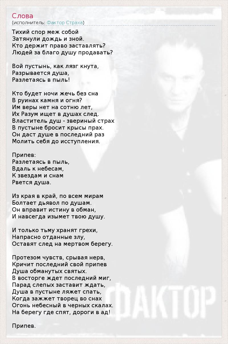 Тихий спор меж собой Затянули дождь и зной. Кто держит право заставлять? Людей за благо душу продавать? Вой пустынь, как лязг кнута, Разрывается душа, Разлетаясь в пыль! Кто будет ночи жечь без сна В руинах камня и огня? Им веры нет на сотню лет, Их Разум ищет в душах след. Властитель душ - звериный страх В пустыне бросит крысы прах. Он даст душе в последний раз Молить себя до исступления. Припев: Разлетаясь в пыль, Вдаль к небесам, К звездам и снам Рвется душа. Из края в край, по всем мирам Болтает дьявол по душам. Он вправит истину в обман, И навсегда изымет твою душу. И только тьму хранят грехи, Напрасно отданные злу, Оставят след на мертвом берегу. Протезом чувств, срывая нерв, Кричит последний свой припев Душа обманутых святых. В восторге ждет последний миг, Парад слепых заставит ждать, Душа в пустыне ляжет спать, Когда зажжет творец во снах Огонь небесный в черных скалах. На берегу где спят, дороги в ад! Припев.