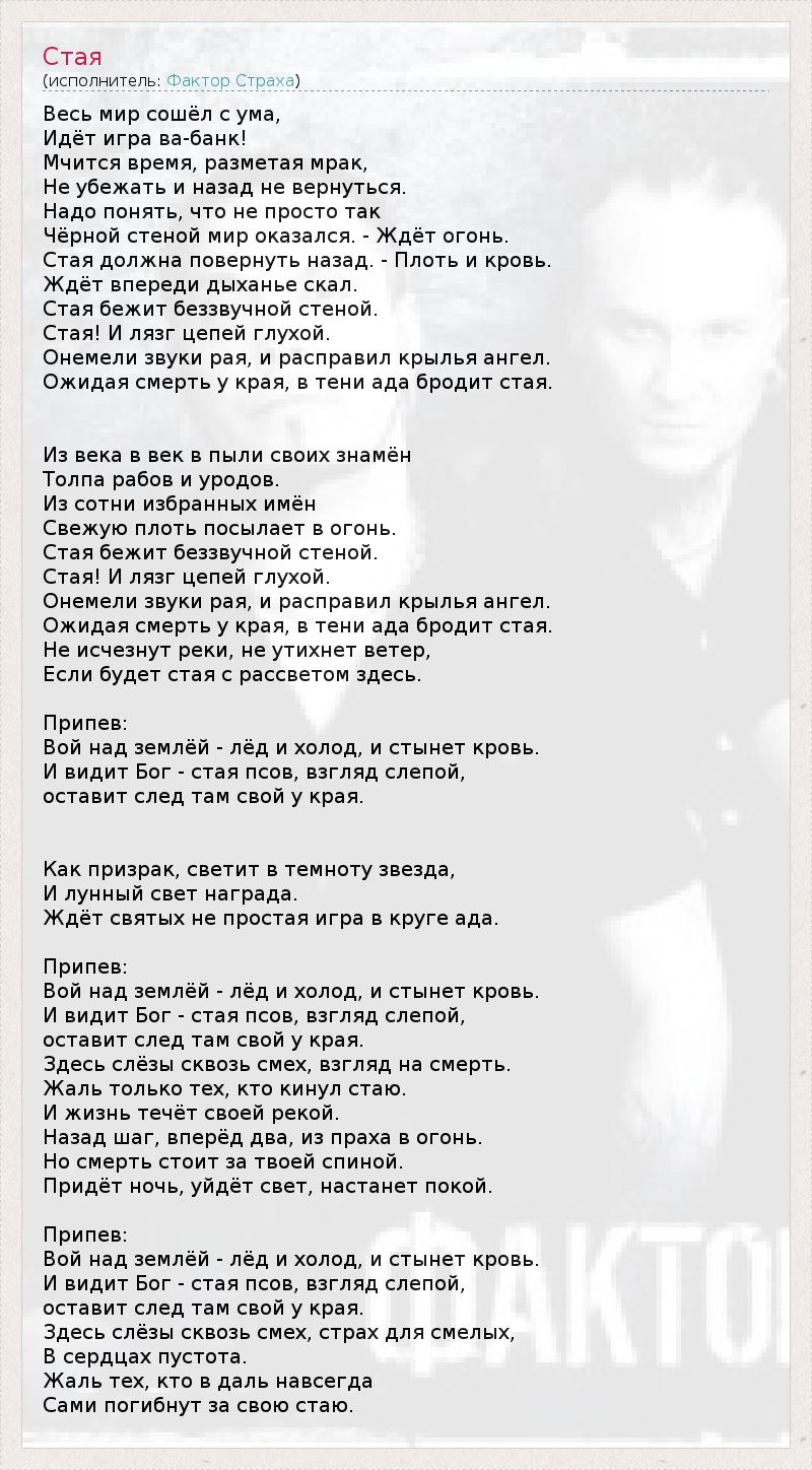 Весь мир сошёл с ума, Идёт игра ва-банк! Мчится время, разметая мрак, Не убежать и назад не вернуться. Надо понять, что не просто так Чёрной стеной мир оказался. - Ждёт огонь. Стая должна повернуть назад. - Плоть и кровь. Ждёт впереди дыханье скал. Стая бежит беззвучной стеной. Стая! И лязг цепей глухой. Онемели звуки рая, и расправил крылья ангел. Ожидая смерть у края, в тени ада бродит стая. Из века в век в пыли своих знамён Толпа рабов и уродов. Из сотни избранных имён Свежую плоть посылает в огонь. Стая бежит беззвучной стеной. Стая! И лязг цепей глухой. Онемели звуки рая, и расправил крылья ангел. Ожидая смерть у края, в тени ада бродит стая. Не исчезнут реки, не утихнет ветер, Если будет стая с рассветом здесь. Припев: Вой над землёй - лёд и холод, и стынет кровь. И видит Бог - стая псов, взгляд слепой, оставит след там свой у края. Как призрак, светит в темноту звезда, И лунный свет награда. Ждёт святых не простая игра в круге ада. Припев: Вой над землёй - лёд и холод, и стынет кровь. И видит Бог - стая псов, взгляд слепой, оставит след там свой у края. Здесь слёзы сквозь смех, взгляд на смерть. Жаль только тех, кто кинул стаю. И жизнь течёт своей рекой. Назад шаг, вперёд два, из праха в огонь. Но смерть стоит за твоей спиной. Придёт ночь, уйдёт свет, настанет покой. Припев: Вой над землёй - лёд и холод, и стынет кровь. И видит Бог - стая псов, взгляд слепой, оставит след там свой у края. Здесь слёзы сквозь смех, страх для смелых, В сердцах пустота. Жаль тех, кто в даль навсегда Сами погибнут за свою стаю.