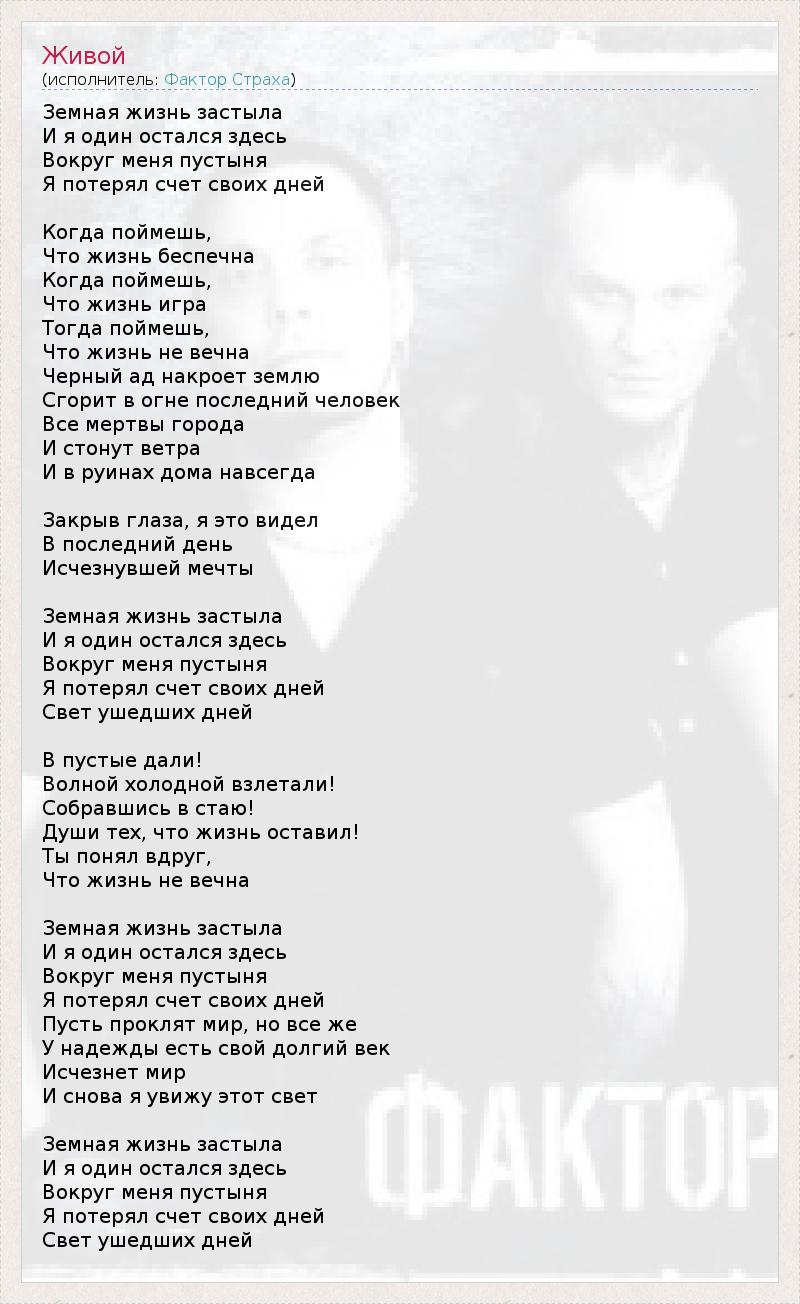 Земная жизнь застыла И я один остался здесь Вокруг меня пустыня Я потерял счет своих дней Когда поймешь, Что жизнь беспечна Когда поймешь, Что жизнь игра Тогда поймешь, Что жизнь не вечна Черный ад накроет землю Сгорит в огне последний человек Все мертвы города И стонут ветра И в руинах дома навсегда Закрыв глаза, я это видел В последний день Исчезнувшей мечты Земная жизнь застыла И я один остался здесь Вокруг меня пустыня Я потерял счет своих дней Свет ушедших дней В пустые дали! Волной холодной взлетали! Собравшись в стаю! Души тех, что жизнь оставил! Ты понял вдруг, Что жизнь не вечна Земная жизнь застыла И я один остался здесь Вокруг меня пустыня Я потерял счет своих дней Пусть проклят мир, но все же У надежды есть свой долгий век Исчезнет мир И снова я увижу этот свет Земная жизнь застыла И я один остался здесь Вокруг меня пустыня Я потерял счет своих дней Свет ушедших дней
