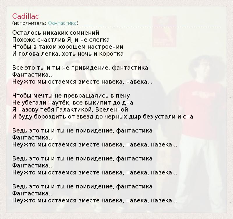 Осталось никаких сомнений Похоже счастлив Я, и не слегка Чтобы в таком хорошем настроении И голова легка, хоть ночь и коротка Все это ты и ты не привидение, фантастика Фантастика... Неужто мы остаемся вместе навека, навека... Чтобы мечты не превращались в пену Не убегали наутёк, все выкипит до дна Я назову тебя Галактикой, Вселенной И буду бороздить от звезд до черных дыр без устали и сна Ведь это ты и ты не привидение, фантастика Фантастика... Неужто мы остаемся вместе навека, навека, навека... Ведь это ты и ты не привидение, фантастика Фантастика... Неужто мы остаемся вместе навека, навека, навека... Ведь это ты и ты не привидение, фантастика Фантастика... Неужто мы остаемся вместе навека, навека, навека...