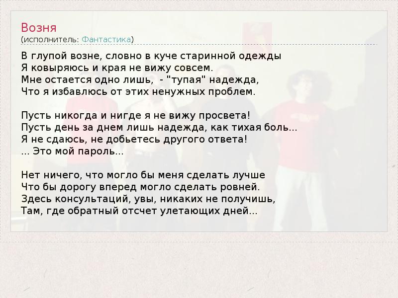 В глупой возне, словно в куче старинной одежды Я ковыряюсь и края не вижу совсем. Мне остается одно лишь, - "тупая" надежда, Что я избавлюсь от этих ненужных проблем. Пусть никогда и нигде я не вижу просвета! Пусть день за днем лишь надежда, как тихая боль... Я не сдаюсь, не добьетесь другого ответа! ... Это мой пароль... Нет ничего, что могло бы меня сделать лучше Что бы дорогу вперед могло сделать ровней. Здесь консультаций, увы, никаких не получишь, Там, где обратный отсчет улетающих дней...