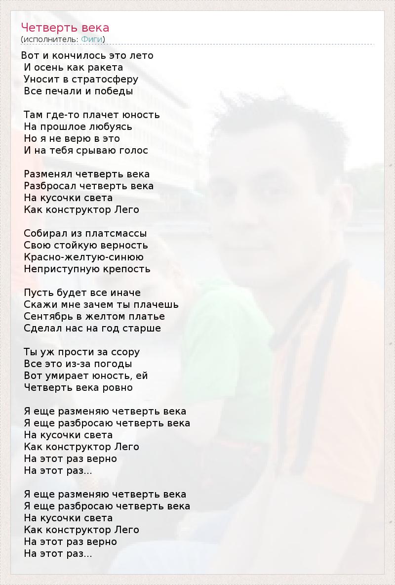 Это интересно:Состав:Олег Иваненко - гитара, вокал; Дмитрий Крейдич - бас-гитара, вокал; Юрий Войнич - барабаны; Рашед Афанасьев - стихи; Павел Мерзляков - гитара (live поддержка)Свою историю группа ведет с 1999 года. Когда в одном подмосковном городке из двух команд Фиг-2 и ЭКГ образовалась группа ФИГИ. И хотя по стилистике эти группы были достаточно различны (Фиг-2 – играл дворовый панк-рок,... продолжение