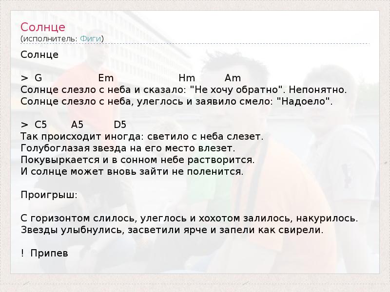 Это интересно:Состав:Олег Иваненко - гитара, вокал; Дмитрий Крейдич - бас-гитара, вокал; Юрий Войнич - барабаны; Рашед Афанасьев - стихи; Павел Мерзляков - гитара (live поддержка)Свою историю группа ведет с 1999 года. Когда в одном подмосковном городке из двух команд Фиг-2 и ЭКГ образовалась группа ФИГИ. И хотя по стилистике эти группы были достаточно различны (Фиг-2 – играл дворовый панк-рок,... продолжение