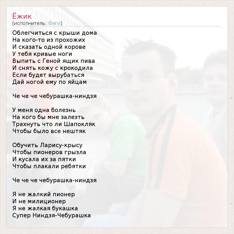 Это интересно:Состав:Олег Иваненко - гитара, вокал; Дмитрий Крейдич - бас-гитара, вокал; Юрий Войнич - барабаны; Рашед Афанасьев - стихи; Павел Мерзляков - гитара (live поддержка)Свою историю группа ведет с 1999 года. Когда в одном подмосковном городке из двух команд Фиг-2 и ЭКГ образовалась группа ФИГИ. И хотя по стилистике эти группы были достаточно различны (Фиг-2 – играл дворовый панк-рок,... продолжение