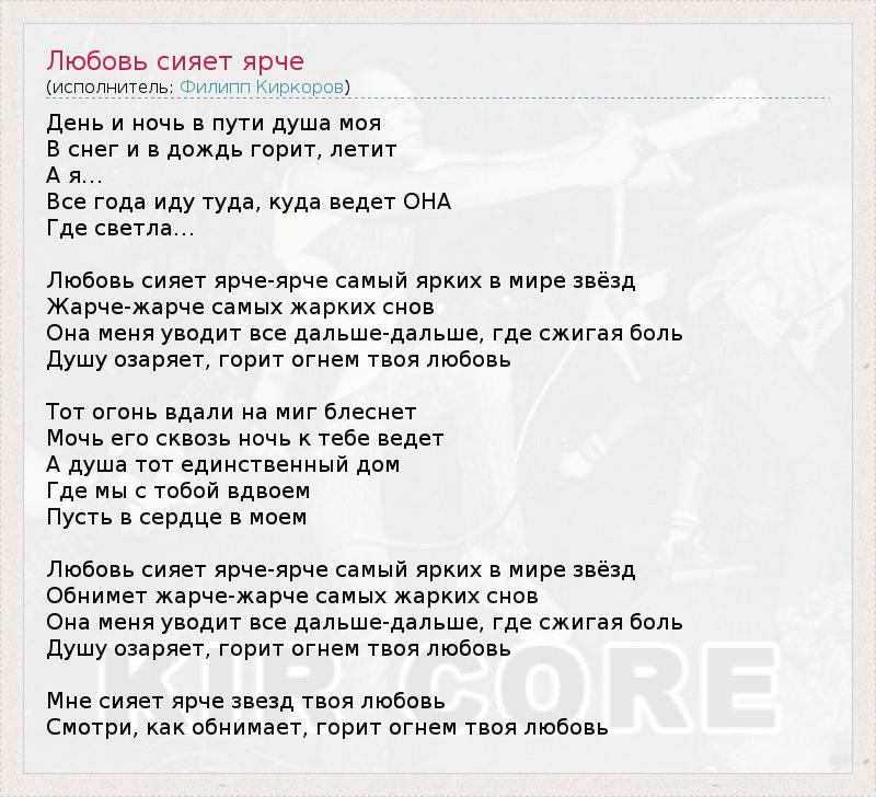 День и ночь в пути душа моя В снег и в дождь горит, летит А я… Все года иду туда, куда ведет ОНА Где светла… Любовь сияет ярче-ярче самый ярких в мире звёзд Жарче-жарче самых жарких снов Она меня уводит все дальше-дальше, где сжигая боль Душу озаряет, горит огнем твоя любовь Тот огонь вдали на миг блеснет Мочь его сквозь ночь к тебе ведет А душа тот единственный дом Где мы с тобой вдвоем Пусть в сердце в моем Любовь сияет ярче-ярче самый ярких в мире звёзд Обнимет жарче-жарче самых жарких снов Она меня уводит все дальше-дальше, где сжигая боль Душу озаряет, горит огнем твоя любовь Мне сияет ярче звезд твоя любовь Смотри, как обнимает, горит огнем твоя любовь