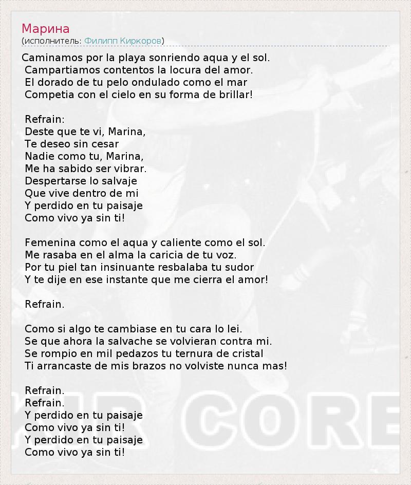 Caminamos por la playa sonriendo aqua y el sol. Campartiamos contentos la locura del amor. El dorado de tu pelo ondulado como el mar Competia con el cielo en su forma de brillar! Refrain: Deste que te vi, Marina, Te deseo sin cesar Nadie como tu, Marina, Me ha sabido ser vibrar. Despertarse lo salvaje Que vive dentro de mi Y perdido en tu paisaje Como vivo ya sin ti! Femenina como el aqua y caliente como el sol. Me rasaba en el alma la caricia de tu voz. Por tu piel tan insinuante resbalaba tu sudor Y te dije en ese instante que me cierra el amor! Refrain. Como si algo te cambiase en tu cara lo lei. Se que ahora la salvache se volvieran contra mi. Se rompio en mil pedazos tu ternura de cristal Ti arrancaste de mis brazos no volviste nunca mas! Refrain. Refrain. Y perdido en tu paisaje Como vivo ya sin ti! Y perdido en tu paisaje Como vivo ya sin ti!