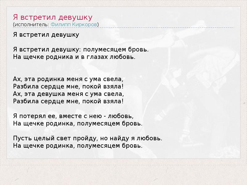 Я встретил девушку Я встретил девушку: полумесяцем бровь. На щечке родника и в глазах любовь. Ах, эта родинка меня с ума свела, Разбила сердце мне, покой взяла! Ах, эта девушка меня с ума свела, Разбила сердце мне, покой взяла! Я потерял ее, вместе с нею - любовь, На щечке родинка, полумесяцем бровь. Пусть целый свет пройду, но найду я любовь. На щечке родинка, полумесяцем бровь.