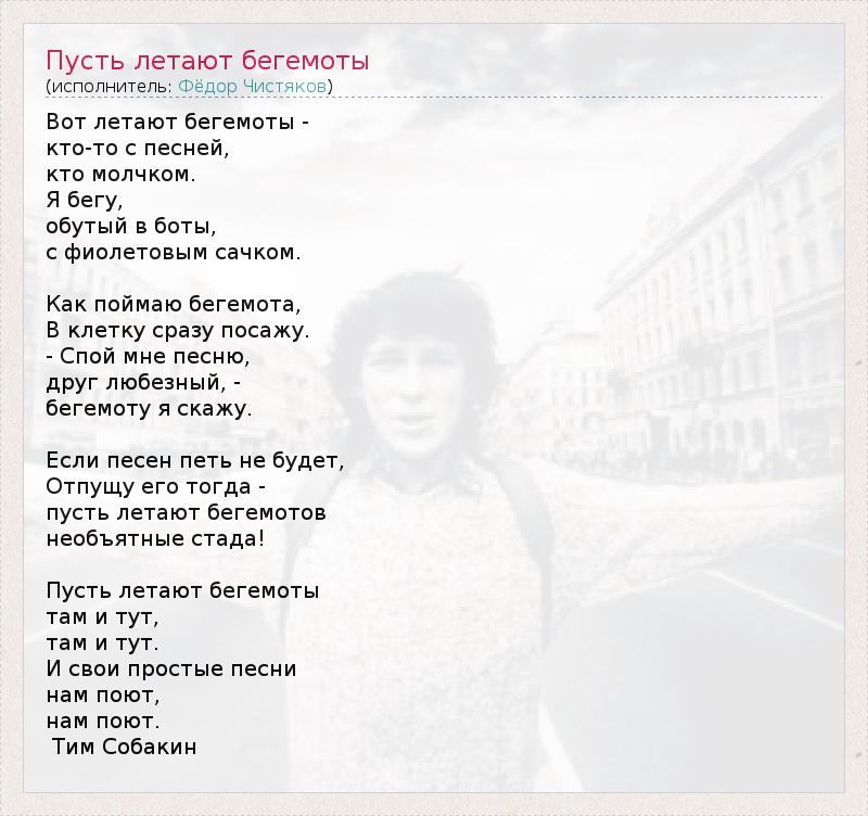 Вот летают бегемоты - кто-то с песней, кто молчком. Я бегу, обутый в боты, с фиолетовым сачком. Как поймаю бегемота, В клетку сразу посажу. - Спой мне песню, друг любезный, - бегемоту я скажу. Если песен петь не будет, Отпущу его тогда - пусть летают бегемотов необъятные стада! Пусть летают бегемоты там и тут, там и тут. И свои простые песни нам поют, нам поют. Тим Собакин