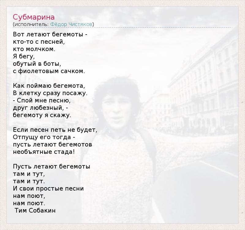 Вот летают бегемоты - кто-то с песней, кто молчком. Я бегу, обутый в боты, с фиолетовым сачком. Как поймаю бегемота, В клетку сразу посажу. - Спой мне песню, друг любезный, - бегемоту я скажу. Если песен петь не будет, Отпущу его тогда - пусть летают бегемотов необъятные стада! Пусть летают бегемоты там и тут, там и тут. И свои простые песни нам поют, нам поют. Тим Собакин