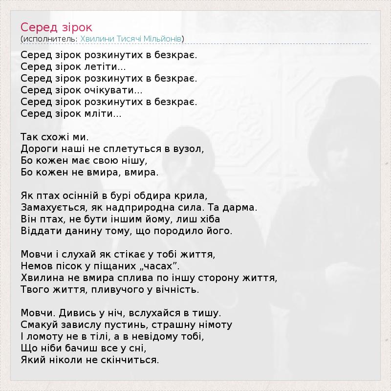Серед зірок розкинутих в безкрає. Серед зірок летіти... Серед зірок розкинутих в безкрає. Серед зірок очікувати... Серед зірок розкинутих в безкрає. Серед зірок мліти... Так схожі ми. Дороги наші не сплетуться в вузол, Бо кожен має свою нішу, Бо кожен не вмира, вмира. Як птах осінній в бурі обдира крила, Замахується, як надприродна сила. Та дарма. Він птах, не бути іншим йому, лиш хіба Віддати данину тому, що породило його. Мовчи і слухай як стікає у тобі життя, Немов пісок у піщаних „часах”. Хвилина не вмира сплива по іншу сторону життя, Твого життя, пливучого у вічність. Мовчи. Дивись у ніч, вслухайся в тишу. Смакуй завислу пустинь, страшну німоту І ломоту не в тілі, а в невідому тобі, Що ніби бачиш все у сні, Який ніколи не скінчиться.