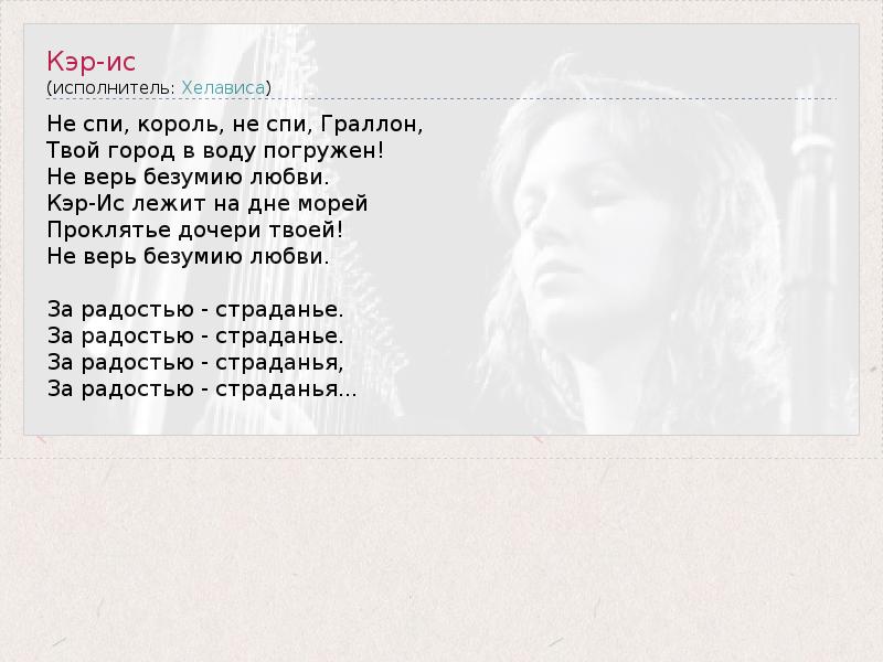 Это интересно:Хелависа (Наталья Андреевна О’Шей — англ. Natalia O'Shea; урожденная Николаева) (р. 3 сентября 1976) — автор песен, музыкант (гитара, ирландская арфа), вокалистка и лидер музыкальных групп: «Мельница» (фолк-рок), «Clann Lir» (традиционный кельтский фолк). Ранее участвовала в проектах «Romanesque» (фолк) и «Тиль... продолжение