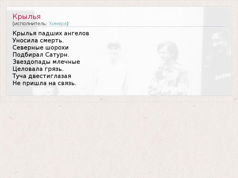Это интересно:ХимерА (http://www.lastfm.ru/music/ХимерА) – верное название металлической группы. Если текущий исполнитель появляется в твоих чартах, пожалуйста, сделай себе и Last.fm пользу. Исправь теги в своих медиафайлах. Спасибо.=== Биография ===Питерская группа “Химера” начала свое существование как “Депутат балтики”, которую создали осенью 1990 года Эдуард Старков... продолжение