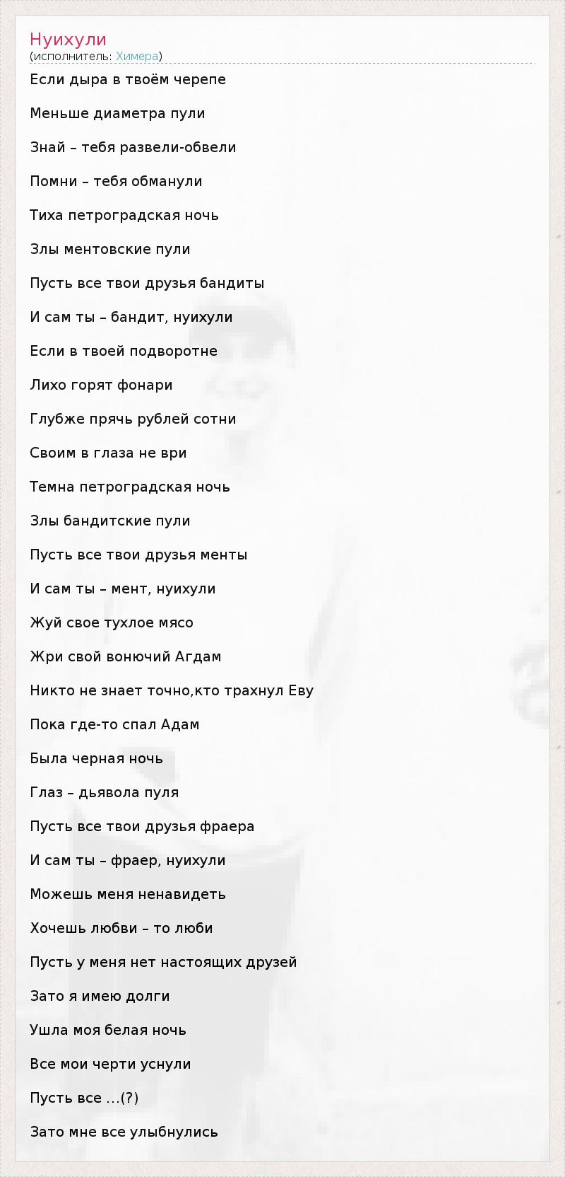 Это интересно:ХимерА (http://www.lastfm.ru/music/ХимерА) – верное название металлической группы. Если текущий исполнитель появляется в твоих чартах, пожалуйста, сделай себе и Last.fm пользу. Исправь теги в своих медиафайлах. Спасибо.=== Биография ===Питерская группа “Химера” начала свое существование как “Депутат балтики”, которую создали осенью 1990 года Эдуард Старков... продолжение
