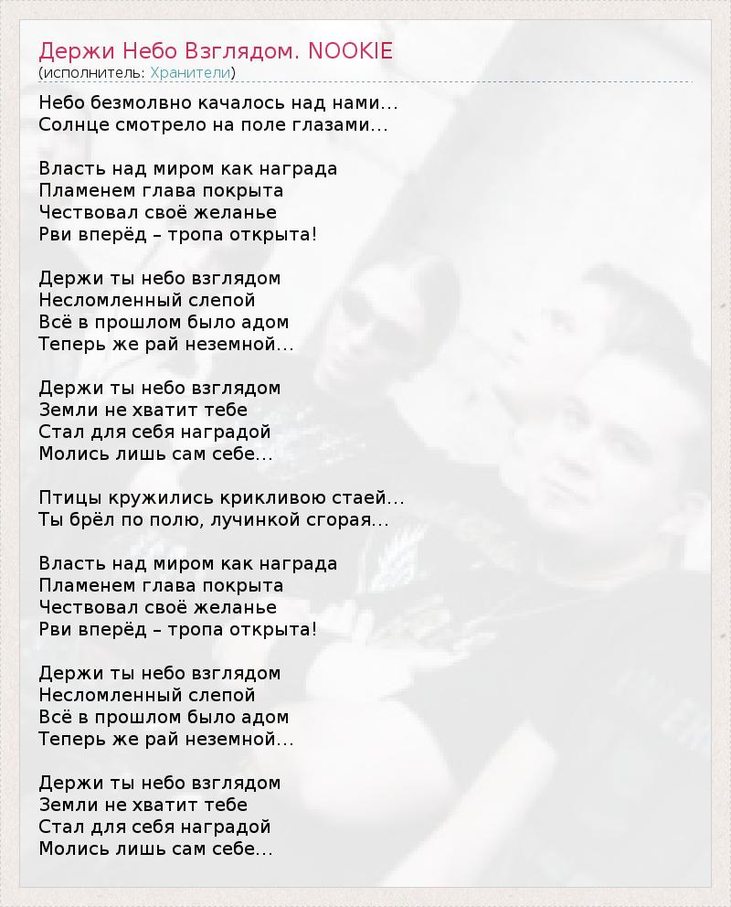 Небо безмолвно качалось над нами… Солнце смотрело на поле глазами… Власть над миром как награда Пламенем глава покрыта Чествовал своё желанье Рви вперёд – тропа открыта! Держи ты небо взглядом Несломленный слепой Всё в прошлом было адом Теперь же рай неземной… Держи ты небо взглядом Земли не хватит тебе Стал для себя наградой Молись лишь сам себе… Птицы кружились крикливою стаей… Ты брёл по полю, лучинкой сгорая… Власть над миром как награда Пламенем глава покрыта Чествовал своё желанье Рви вперёд – тропа открыта! Держи ты небо взглядом Несломленный слепой Всё в прошлом было адом Теперь же рай неземной… Держи ты небо взглядом Земли не хватит тебе Стал для себя наградой Молись лишь сам себе… Хранители - Держи небо взглядом (feat. Nookie (Слот) & Lars (Эпидемия)) - Текст песни, слушать онлайн Хранители - Держи небо взглядом (feat. Nookie (Слот) & Lars (Эпидемия)) - Текст песни, слушать онлайн Небо безмолвно качалось над нами… Солнце смотрело на поле глазами… Власть над миром как награда Пламенем глава покрыта Чествовал своё желанье Рви вперёд – тропа открыта! Держи ты небо взглядом Несломленный слепой Всё в прошлом было адом Теперь же рай неземной… Держи ты небо взглядом Земли не хватит тебе Стал для себя наградой Молись лишь сам себе… Птицы кружились крикливою стаей… Ты брёл по полю, лучинкой сгорая… Власть над миром как награда Пламенем глава покрыта Чествовал своё желанье Рви вперёд – тропа открыта! Держи ты небо взглядом Несломленный слепой Всё в прошлом было адом Теперь же рай неземной… Держи ты небо взглядом Земли не хватит тебе Стал для себя наградой Молись лишь сам себе… Хранители - Держи небо взглядом (feat. Nookie (Слот) & Lars (Эпидемия)) - Текст песни, слушать онлайн Хранители - Держи небо взглядом (feat. Nookie (Слот) & Lars (Эпидемия)) - Текст песни, слушать онлайн