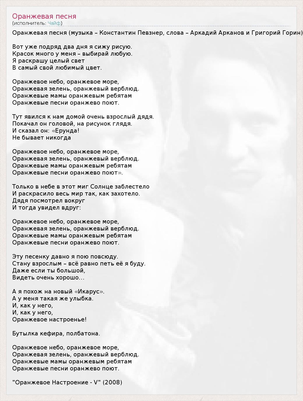 Оранжевая песня (музыка – Константин Певзнер, слова – Аркадий Арканов и Григорий Горин) Вот уже подряд два дня я сижу рисую. Красок много у меня – выбирай любую. Я раскрашу целый свет В самый свой любимый цвет. Оранжевое небо, оранжевое море, Оранжевая зелень, оранжевый верблюд. Оранжевые мамы оранжевым ребятам Оранжевые песни оранжево поют. Тут явился к нам домой очень взрослый дядя. Покачал он головой, на рисунок глядя. И сказал он: «Ерунда! Не бывает никогда Оранжевое небо, оранжевое море, Оранжевая зелень, оранжевый верблюд. Оранжевые мамы оранжевым ребятам Оранжевые песни оранжево поют». Только в небе в этот миг Солнце заблестело И раскрасило весь мир так, как захотело. Дядя посмотрел вокруг И тогда увидел вдруг: Оранжевое небо, оранжевое море, Оранжевая зелень, оранжевый верблюд. Оранжевые мамы оранжевым ребятам Оранжевые песни оранжево поют. Эту песенку давно я пою повсюду. Стану взрослым – всё равно петь её я буду. Даже если ты большой, Видеть очень хорошо… А я похож на новый «Икарус». А у меня такая же улыбка. И, как у него, И, как у него, Оранжевое настроенье! Бутылка кефира, полбатона. Оранжевое небо, оранжевое море, Оранжевая зелень, оранжевый верблюд. Оранжевые мамы оранжевым ребятам Оранжевые песни оранжево поют. "Оранжевое Настроение - V" (2008)