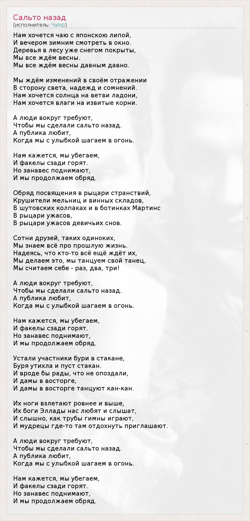 Нам хочется чаю с японскою липой, И вечером зимним смотреть в окно. Деревья в лесу уже снегом покрыты, Мы все ждём весны. Мы все ждём весны давным давно. Мы ждём изменений в своём отражении В сторону света, надежд и сомнений. Нам хочется солнца на ветви ладони, Нам хочется влаги на извитые корни. А люди вокруг требуют, Чтобы мы сделали сальто назад. А публика любит, Когда мы с улыбкой шагаем в огонь. Нам кажется, мы убегаем, И факелы сзади горят. Но занавес поднимают, И мы продолжаем обряд. Обряд посвящения в рыцари странствий, Крушители мельниц и винных складов, В шутовских колпаках и в ботинках Мартинс В рыцари ужасов, В рыцари ужасов девичьих снов. Сотни друзей, таких одиноких, Мы знаем всё про прошлую жизнь. Надеясь, что кто-то всё ещё ждёт их, Мы делаем это, мы танцуем свой танец, Мы считаем себе - раз, два, три! А люди вокруг требуют, Чтобы мы сделали сальто назад. А публика любит, Когда мы с улыбкой шагаем в огонь. Нам кажется, мы убегаем, И факелы сзади горят. Но занавес поднимают, И мы продолжаем обряд. Устали участники бури в стакане, Буря утихла и пуст стакан. И вроде бы рады, что не опоздали, И дамы в восторге, И дамы в восторге танцуют кан-кан. Их ноги взлетают ровнее и выше, Их боги Эллады нас любят и слышат, И слышно, как трубы гимны играют, И мудрецы где-то там отдохнуть приглашают. А люди вокруг требуют, Чтобы мы сделали сальто назад. А публика любит, Когда мы с улыбкой шагаем в огонь. Нам кажется, мы убегаем, И факелы сзади горят. Но занавес поднимают, И мы продолжаем обряд.