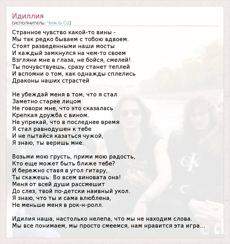 Это интересно:Лидер группы и автор почти всех песен, Сергей 'Чиж' Чиграков, родился 6 февраля 1961 в городе Дзержинске. С 14 лет он вместе со своим старшим братом играет в местных ансамблях, иногда подменяя кого-нибудь из музыкантов. Там же оканчивает музыкальную школу и училище. Настоящим "взрослым" опытом стала для него работа в дзержинской группе "ГПД" ("Группа Продлённого Дня"). Группа... продолжение