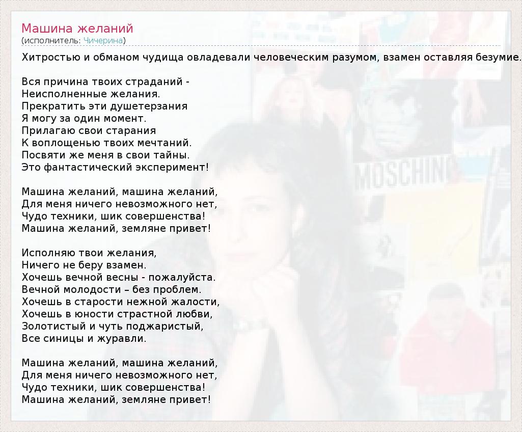 ГлавнаяИсполнителиЧичеринаМашина желаний