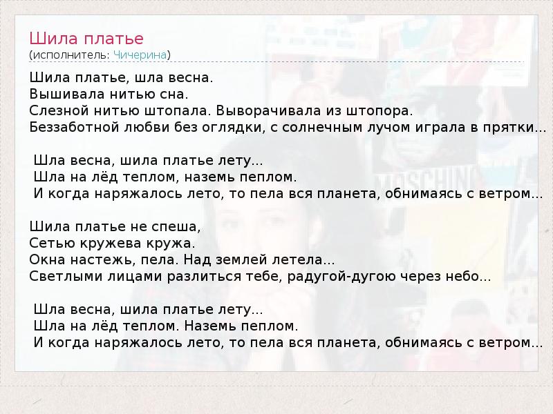 Шила платье, шла весна. Вышивала нитью сна. Слезной нитью штопала. Выворачивала из штопора. Беззаботной любви без оглядки, с солнечным лучом играла в прятки... Шла весна, шила платье лету... Шла на лёд теплом, наземь пеплом. И когда наряжалось лето, то пела вся планета, обнимаясь с ветром... Шила платье не спеша, Сетью кружева кружа. Окна настежь, пела. Над землей летела... Светлыми лицами разлиться тебе, радугой-дугою через небо... Шла весна, шила платье лету... Шла на лёд теплом. Наземь пеплом. И когда наряжалось лето, то пела вся планета, обнимаясь с ветром...