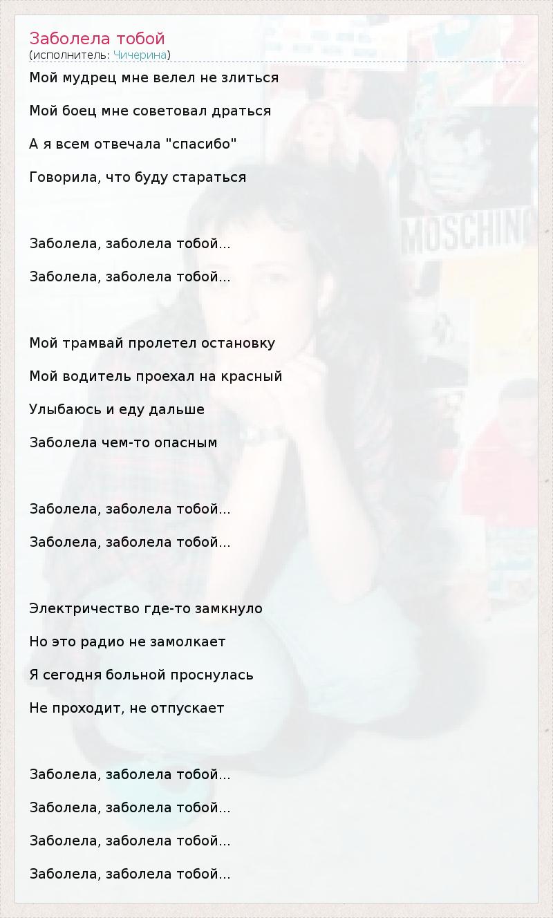 Мой мудрец мне велел не злиться Мой боец мне советовал драться А я всем отвечала "спасибо" Говорила, что буду стараться Заболела, заболела тобой... Заболела, заболела тобой... Мой трамвай пролетел остановку Мой водитель проехал на красный Улыбаюсь и еду дальше Заболела чем-то опасным Заболела, заболела тобой... Заболела, заболела тобой... Электричество где-то замкнуло Но это радио не замолкает Я сегодня больной проснулась Не проходит, не отпускает Заболела, заболела тобой... Заболела, заболела тобой... Заболела, заболела тобой... Заболела, заболела тобой...