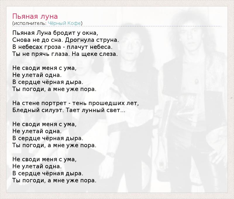 Пьяная Луна бродит у окна, Снова не до сна. Дрогнула струна. В небесах гроза - плачут небеса. Ты не прячь глаза. На щеке слеза. Не своди меня с ума, Не улетай одна. В сердце чёрная дыра. Ты погоди, а мне уже пора. На стене портрет - тень прошедших лет, Бледный силуэт. Тает лунный свет... Не своди меня с ума, Не улетай одна. В сердце чёрная дыра. Ты погоди, а мне уже пора. Не своди меня с ума, Не улетай одна. В сердце чёрная дыра. Ты погоди, а мне уже пора.